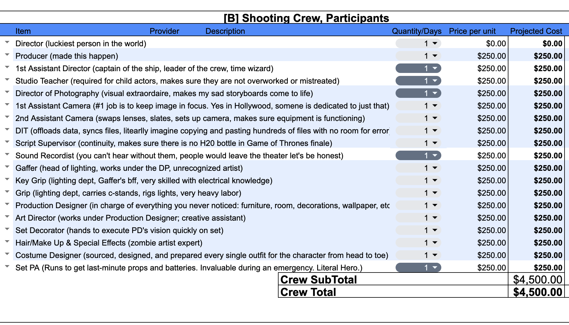 Sample budget of crew cost for 1 day at minimum wage.